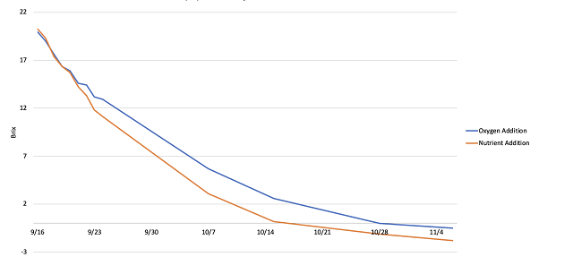Fermentation began in a robust manner; however, kinetics of the fermentation began to level off slightly on 9/19 (Figure 1). Additions of nitrogen nutrients or oxygen were made on 9/20. Both fermentations benefited from additions with the nitrogen addition leading to a steeper increase in fermentation rate than the oxygen addition (Figure 1b). The difference in fermentation rate persisted through the rest of the fermentation, with the oxygen treated fermentation slowing down much sooner that the nitrogen treated fermentation.