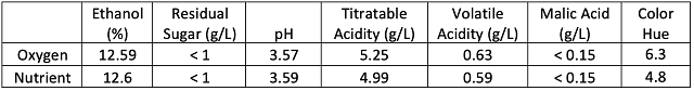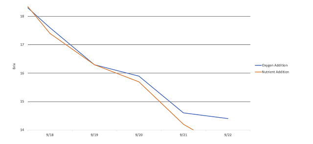 According to ScottLabs recommendations, the full nutrient addition plan would involve adding 20 g/hL of Fermaid O at a 2-3° Brix drop, followed by an additional 40 g/hL when the Brix drops by 1/3. In this experiment, one fermentation received 35 g/hL of Fermaid O at a 4° Brix drop, while the other received 10 minutes of aeration. Juice was aerated with a pumpover for 10 minutes with the goal of providing enough oxygen for yeast cell membrane development while avoiding juice oxidation (indicated by an increase in dissolved oxygen) or feeding spoilage organisms (that would result in production of acetic acid and ethyl acetate). Both nutrient addition and intentional aeration led to a small change in dissolved oxygen, but the aeration resulted in higher DO (Table 2). As a reference, dissolved oxygen of <0.5 mg/L is desired for white wines at bottling. A dissolved oxygen of 0.8 mg/L indicates oxygen was available to yeast cells.