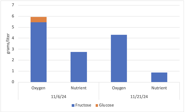 In November, both wines still had a small amount of residual sugar (Figure 2). The wine that received nutrient addition was able to consume all the glucose and much of the fructose by the end of November, while the oxygenated wine still had above 4 g/L fructose on 11/21/24 (Figure 2). The wine that received nitrogen supplementation during fermentation completed fermentation with lower volatile acidity and lower color hue (a measure of browning)(Table 3). The oxygenated fermentation produced wine with slightly lower sulfides, but all values in both wines were below threshold values (Figure 3). Sensory analysis was not done on these wines, as there was perceptible oxidation in the oxygen treated wine that would have obscured other aromatic indicators.