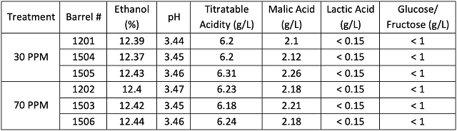 Sensory analysis was completed by a panel of 15 wine producers using shipped samples. Each wine producer received four wines in identical bottles, filled on the same day, each coded with random numbers. Two of the bottles contained 30 ppm wine while two other bottles contained 70 ppm wine. Participants were asked to group the samples into 2 groups of 2 based on similarity. There were four tasting groups per flight with the wines presented in different order for each group. Participants were then asked to score each wine on a scale of 0 to 10 for aromatic intensity, volume, and finish. They were also given open ended questions to describe the wines. Results for the triangle test were analyzed using a one-tailed Z test. Descriptive scores were analyzed using repeated measures ANOVA.
