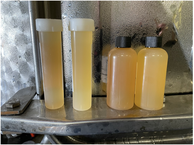 Freezing kills some microbes, and although some will survive, they do not generally represent the entire population that was present before freezing. To assess the microbial community of juice populations, juice samples were centrifuged to collect cells at the bottom of the tube, then the juice was decanted into a second tube, separating cells from juice. Both tubes were sent as a pair to ETS overnight. At ETS, the juice was poured back into the original tube to reconstitute the initial concentration of cells.