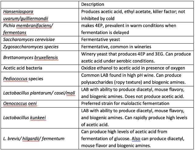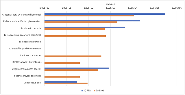 The juice that received 70 ppm SO2 had 10 times fewer cells/mL of the common spoilage organisms Hanseniaspora, Pichia, and acetic acid bacteria (Figure 2). These organisms can be responsible for producing acetic acid, ethyl acetate and even 4EP (Table 2). Saccharomyces and Oenococcus were rare in this analysis.