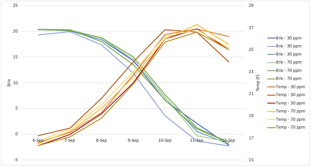 Figure 3: Fermentation kinetics for six barrels of Chardonnay. Barrels that received 30 ppm SO2 at crush are shown in blue (Brix) and orange/red (Temp) while barrels that received 70 ppm SO2 are shown in green (Brix) and yellow (Temp).