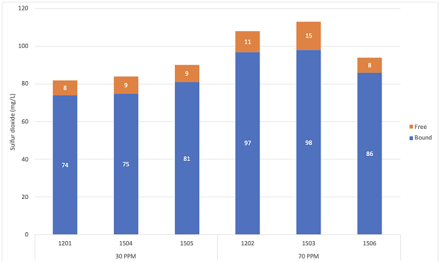 Wine made from juice that received the 70 ppm SO2 addition at crush completed fermentation with higher total SO2 than the wine that received 30 ppm SO2. (Figure 4). However, though the “high” addition was 40 mg/L higher than the “low” addition, the average total SO2 only increased by 20 mg/L. Not all added SO2 results in bound sulfite, some is lost by oxidation reactions to form sulfuric acid and other sulfonates or precipitation with lees3,4. All color measurements were below the detection threshold (<0.1)(data not shown).