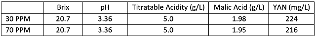 There was no difference in Chardonnay juice chemistry after the tanks were split and SO2 had been added (Table 1). In-house analysis showed that the juice receiving 30 ppm addition of SO2 had no detectable free SO2 (<3 ppm) prior to inoculation while the juice receiving 70 ppm addition had 7.4 ppm free SO2. The juice that was treated with 70 ppm SO2 was visibly lighter in color than the juice treated with 30 ppm SO2 (Figure 1).