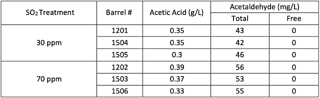 Table 3: Post fermentation acetic acid and acetaldehyde found in three barrels each of two treatments of Chardonnay (ICV Labs, 9/25/23)