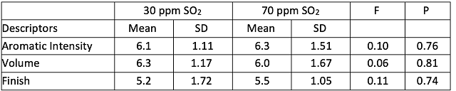 In a sensory analysis of wines treated with either 30ppm SO2 or 70ppm SO2, only 6 out of 15 respondents were able to distinguish which wines should be grouped together, indicating the wines were not significantly different (Z=0.27, p=0.39). There were also no significant differences in scores for aromatic intensity, volume, or finish (Table 4).