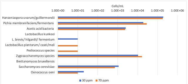 Many winemakers also rely on SO2 additions at crush for antimicrobial protection. As a multifaceted antiseptic, SO2 suppresses fermentation in sensitive organisms while allowing the more tolerant Saccharomyces cerevisiae to dominate. In this way, SO2 both inhibits spoilage microorganisms and selects for beneficial yeast2. However, the susceptibility of non-Saccharomyces yeast and bacteria to SO2 varies widely, depending on the organism’s growth phase and surrounding environmental conditions3. More than 93 different species of yeast and over 50 species of bacteria have been isolated from grape berries, many of which carry over into juice during pressing4. A commonly cited antimicrobial target of 0.875 – 1.25 mg/L molecular SO2 is thought to decrease the microbial community by several orders of magnitude, and may be sufficient to inhibit growth of most wild yeasts and bacteria3,5. However, when the initial microbial loads are high (as is often the case in Virginia), even a 99% reduction leaves substantial populations behind3.