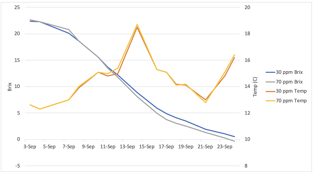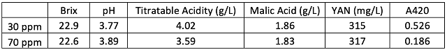 Fruit was harvested with characteristic chemistry for Viognier, with relatively high Brix and high pH (Table 1). There was a noticeable difference in color between the two juice samples. Higher SO2 addition likely led to much lower browning in the juice. There was a noticeable increase in pH and decrease in TA in the juice that received 70 ppm treatment because this sample was refrigerated before testing while the 30 ppm treatment was tested upon delivery. This difference was unlikely due to SO2 treatment.