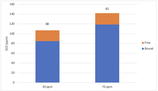 As expected, the wine with higher SO2 addition at crush finished fermentation and entered aging with higher total SO2, despite nearly identical free SO2 (22 and 23 ppm). Likewise, the wine that received 70 ppm to the juice before fermentation had a higher concentration of acetaldehyde post fermentation (Figure 3). Acetaldehdye is a primary binder of SO2, so it is not surprising that the free acetaldehyde value was zero. However, during aging, the equilibrium of free and bound SO2 can shift to release bound acetaldehyde. Acetaldehdye values below 100 mg/L are below the sensory threshold, so will not impart bruised apple character. At low concentrations acetaldehyde may even contribute to fruity aroma11.