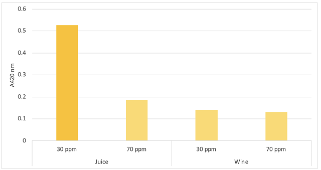 Figure 4: Comparison of browning (A420 nm) in juice (Imbibe Solutions) and wine (ICV Labs)