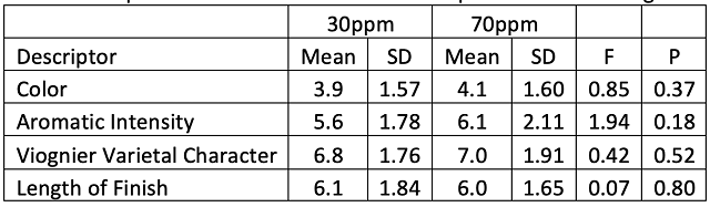 Sensory analysis was completed by a panel of 30 wine producers. Wines were presented blind in randomly numbered glasses. Tasters were presented with three wines, two of one type and one of another, and asked to identify which wine was different (a triangle test). There were four tasting groups with the unique wine in the triangle test balanced between groups. Tasters were then asked to score each wine on a scale of 0 to 10 for color, aromatic intensity, Viognier varietal characteristic, and length of finish. Results for the triangle test were analyzed using a one-tailed Z test. Descriptive scores were analyzed using repeated measures ANOVA.