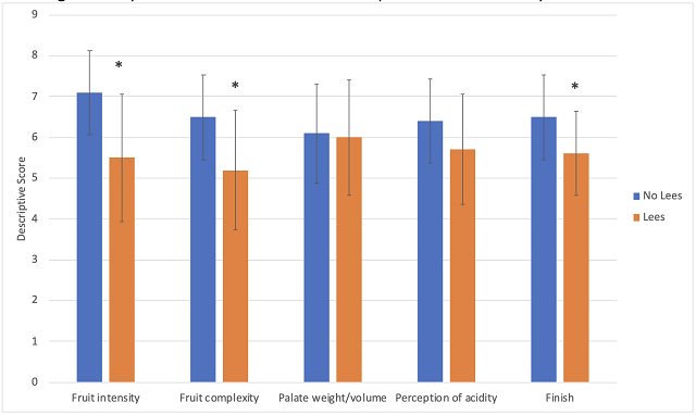 In a triangle test of Albariño that was bottled early or aged on lees, 11 out of 25 winemakers were able to distinguish which wine was different, indicating that the wines were not significantly different (Z=0.92, p=0.18). The early bottled wine scored significantly higher than the lees aged wine for fruit intensity, fruit complexity, and length of finish (p=0.01, p=0.00, p=0.02). There were no significant differences in scores for palate weight/volume and perception of acidity (Figure 2). Open ended responses indicated that some winemakers felt that the lees aged wine felt older and more tired than the wine without lees, both aromatically and on the palate.