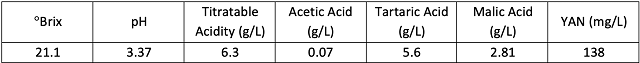 Fruit was clean and ripe at harvest (Table 1) and proceeded through a robust fermentation. At the completion of fermentation, the wine had low acetic acid and no detectable lactic acid, indicating the wine had not undergone malolactic fermentation (Table 2).