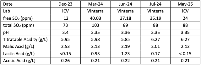Table 4: Wine chemistry at the time of sensory analysis (ICV Labs, May 2025)