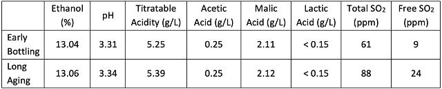 The winemaking goal for the long aging wine was to increase mouthfeel/palate weight while maintaining freshness and fruit character. One of the main concerns of long aging on lees was that the wine would change character due to malolactic fermentation. Malolactic fermentation is thought to be inhibited when total SO2 is greater than 50 ppm, so in theory, the 100 ppm addition at the end of fermentation should have been sufficient to prevent this conversion.
