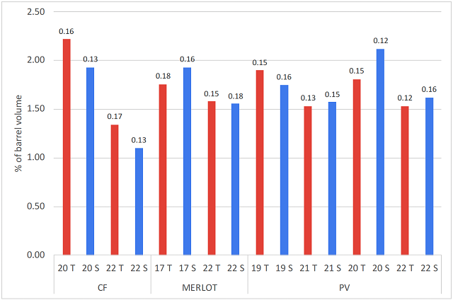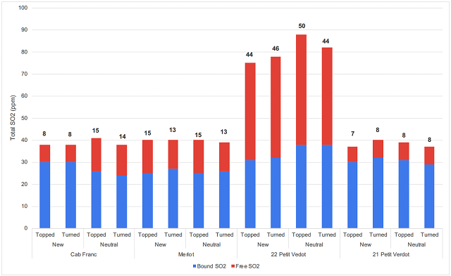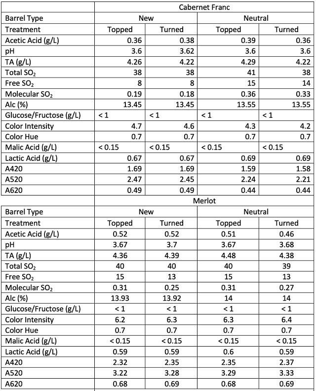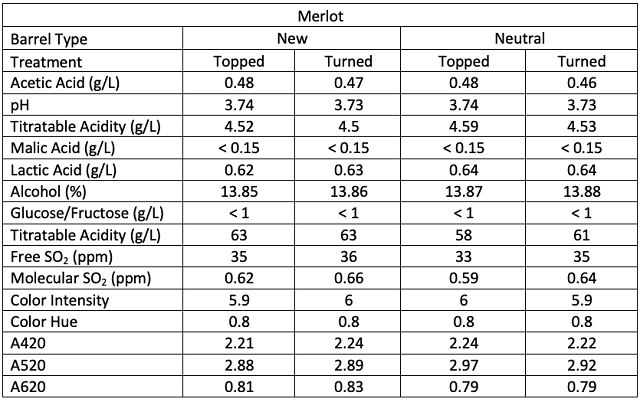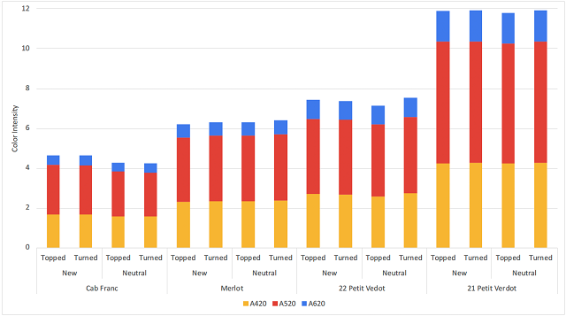 Contrary to expectations, new barrels did not require more topping wine than older barrels. Topping volumes for this experiment were not recorded until after malolactic fermentation had finished. The additional volume of wine expected to be needed for new barrels had likely already been absorbed into barrel staves before measurements began.