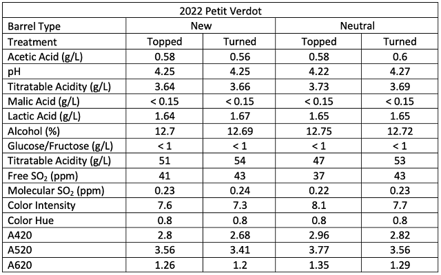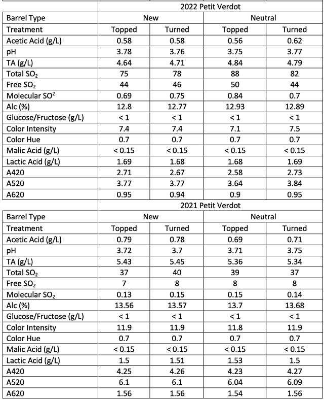 Petit Verdot grapes (4.7 tons) were hand harvested from King Family Vineyards PVB Block on 9/30/22, chilled overnight, then destemmed into tank without crushing with the addition of 70 g (24 ppm) SO2 on 10/1/22. Fermentation was inoculated with 12 g/hL D254 Yeast (Scottlabs). Cap management occurred twice daily with once daily fermentation monitoring. An additional 10 g/hL D254 yeast was added on 10/4. Fermoplus 1er Cru complex yeast nutrient (AEB, 15 g/hL) was added on 10/06/22. Fermentation progressed until 10/17/22. Wine was drained and pressed on 11/1/22, allowed to settle in tank overnight, then transferred into barrels for malolactic fermentation on 11/2/22. Malolactic fermentation was complete by 11/11/22, when 70 g/hL SO2 and 3.33 g/hL Stab Micro M were added to each barrel. Tartaric acid (2.5 g/L) was added on 11/21/22 before barrels were turned. At this time, two pairs of barrels were chosen for experimentation, one pair of older (2020) barrels and one pair of new (2022) barrels (Table 1).