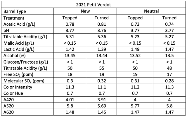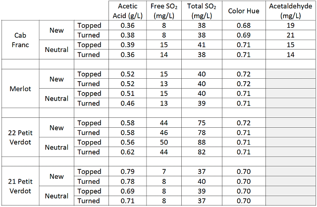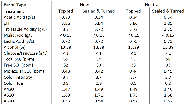 Table 3: Post-aging wine chemistry of topped vs. sealed & turned barrels (May 30, ICV Labs)