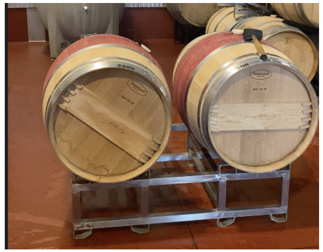 Cabernet Franc grapes (4.27 tons) were hand harvested from the King Family A214 block on 9/29/22, chilled overnight, then destemmed without crushing to concrete tank for fermentation. Fermentation was inoculated with 12 g/hL Excellence XR Yeast (Lamothe Abiet). Cap management occurred twice daily with once daily fermentation monitoring until 10/17/22. Free run wine was drained and must was pressed on 10/31/22. Wine was allowed to settle for a full day before transfer to barrels for malolactic fermentation (without inoculation). Malolactic fermentation was complete by 11/11/22, when 70 mg/L SO2 and 3.33 g/hL Stab Micro M were added to each barrel. Tartaric acid (1 g/L) was added on 11/21/21. At this time, two pairs of barrels were chosen for experimentation, one pair of older (2020) barrels and one pair of new (2022) barrels (Table 1).