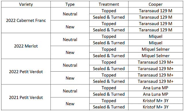 There were 4 lots of wine used in this experiment, one lot each of Cabernet Franc and Merlot, and two lots of Petit Verdot. There were four barrels of wine per lot, two new barrels of the same cooper and type and two used barrels of the same cooper and type (Table 1). Each “pair” (one sealed, one turned) was stored on the same barrel rack to ensure similar environmental conditions (humidity, airflow, temperature) (Figure 1).