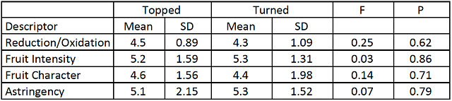 Table 5: Astringency scores for Cabernet Franc stored in topped vs. turned barrels