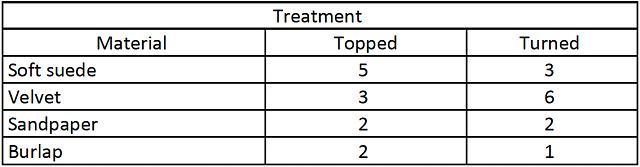 In a triangle test comparing Cabernet Franc aged in topped vs. sealed & turned barrels, 12 out of 28 respondents were able to distinguish which wine was different, indicating the wines were not significantly different (Z=-0.87, p= 0.19). There were also no significant differences in scores for any of the descriptors (Table 4). When asked to compare the astringency of wine to 4 different tactile fabrics, the highest number (5 tasters) selected soft suede to describe the control wine and in the turned wine the highest selection was velvet with 6 tasters (Table 5), indicating wine stored in turned barrels may have been slightly more astringent.